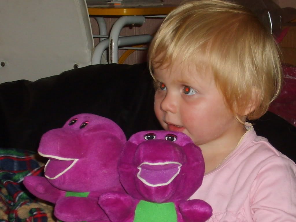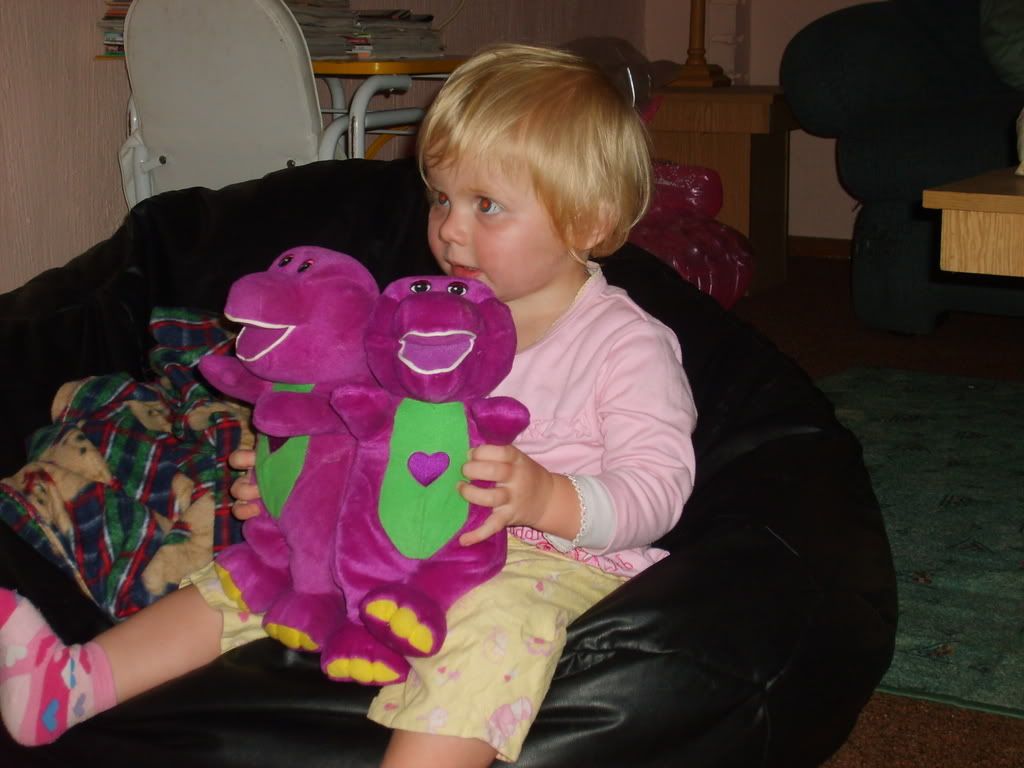 Claudia had a great idea "barney Teddy" (x 2), time to introduce they to the Barney Movies -- they BOTH had to sit with her and watch Barney... so darn cute!!!